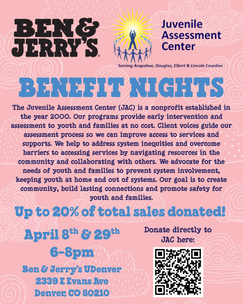Ben & Jerry’s Benefit Nights Stop by Ben & Jerrys UDenver for a sweet treat to support your local JAC! Up to 20% of total sales donated!